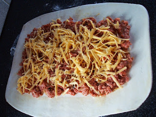 and no.2.son declared the variation on "minced meat pie" where finely chopped cooked onions and minced beef are spread over a rectangle of puff pastry, grated cheese atop rolled and sliced into "pin wheels" to be BETTER than the previously popular "classic minced beef 'n'onion pie" from the previously popular Jamie Oliver cook book! seriously easy to "make" and quick to bake .. ideal for a family!